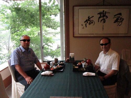 錦川にかかる、錦帯橋から、岩国国際観光ホテルを、望む。旧友の待つホテルに、向かいました。 岩国国際観光ホテルロビー。予約していた食事まで時間があるので、写真撮りの許可をもらい、スタッフさんにホテル内を案内してもらいました。 椭奇「寄明月」