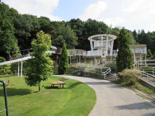 高台の散策道から、やまぐちフラワーランドを望む。 奥の高台にある展望台。すぐ下には、テーブルと椅子が設置されていて、休憩や歓談ができます。 展望台からやまぐちフラワーランドを望む。 センタープラザ屋上プロムナードから自由広場を望む。山の中腹に…