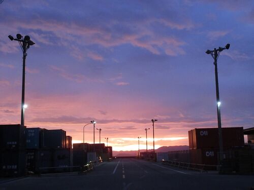 コンテナヤードの夜明け。外国船貿易港(岩国市新港町)。 瀬戸内海の黎明。前島から陽が昇ります。(岩国市由宇町神東の国道188号線から撮影)。 サザンセト伊保庄マリンパーク(柳井市伊保庄黒島上)。遠くに大島大橋が望めます。 海岸の岩場で泳ぐ子供…