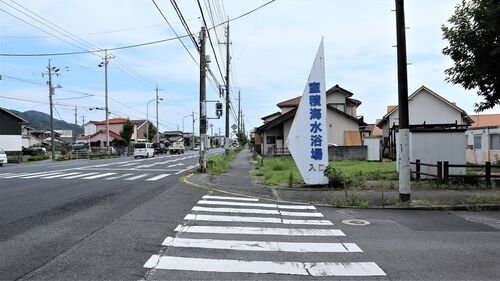 室積海水浴場入口。今回は、お盆を過ぎて室積海岸を訪れました。国道188号線沿いの入口から南側の道路を進めばすぐ室積海水浴場があります。室積海岸は瀬戸内海国立公園に指定されています。【他の写真】 この入口の道路の突き当りが室積海岸で、その大部…
