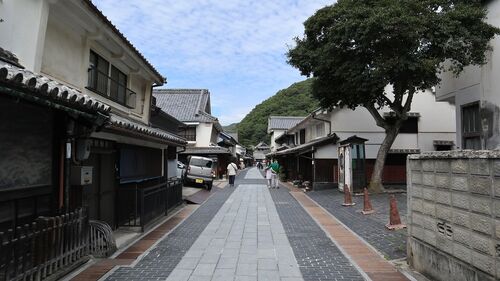 【たけはら町並み保存地区】 たけはら町並み保存地区を散策、歴史的建築物などを見学しながら中間点位まで来ました。昔ながらの伝統的木造建築の屋敷が立ち並ぶ通りは、塩田と町人文化の隆盛が生んだ歴史の風情が漂っていました。ちなみに竹原市は「北前船寄…