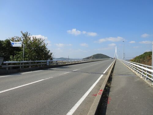 周防大橋を西(深溝・藤尾山公園側)から、東(秋穂二島<あいおふたじま>・幸崎<こうさき>公園側)に向かって車で渡りました。 周防大橋は全長1040m。 秋穂二島(橋の下流)から周防大橋を望む。 橋の左側の小山は、藤尾山公園(標高69m)。 周…