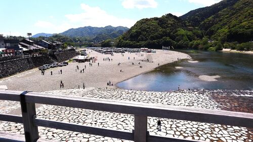 【錦帯橋から下流の下河原駐車場右端の射撃演武会場を望む】 吉香公園(岩国市横山地区)を出発した岩国藩鉄砲隊の隊列行進は、山口県最大の大河、錦川に架かる錦帯橋を渡って岩国地区に出て、錦帯橋下流の下河原駐車場の射撃演武会場に向かっています。【他…
